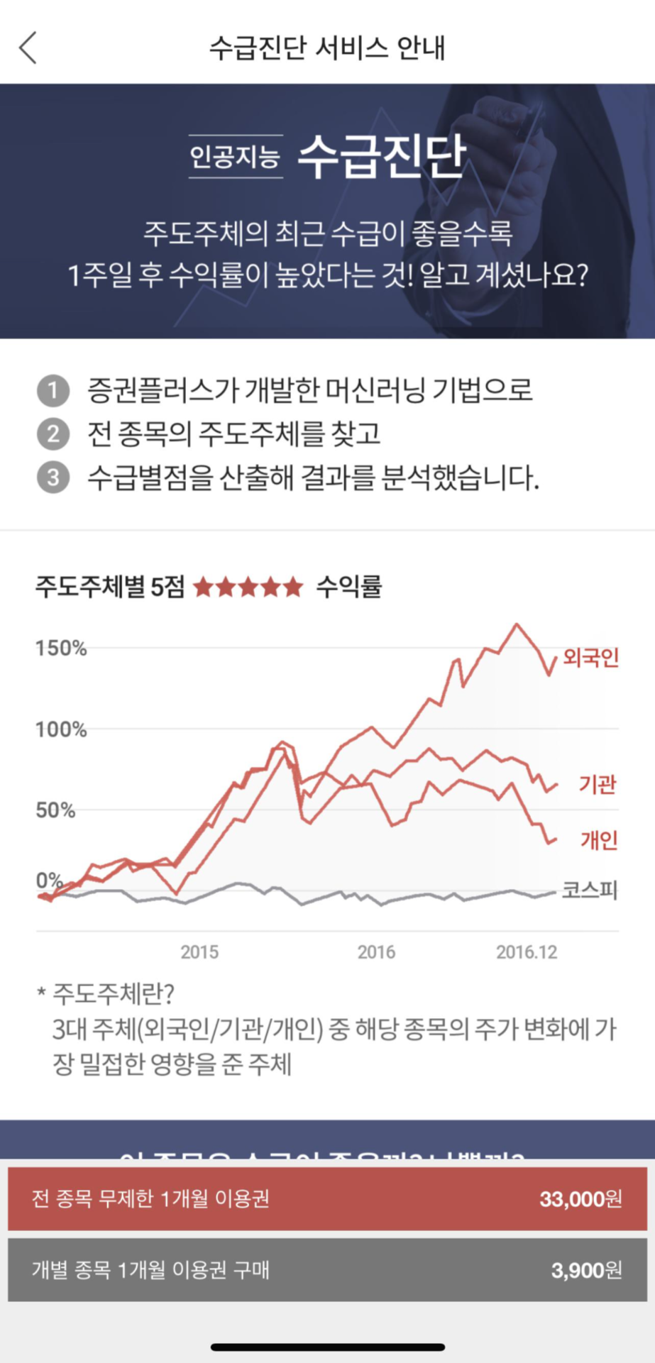 몇개월 해보니 물리는 종목들이 많이 생기는것 같아서 증권플러스에서 제공하는 수급진단정보도 결재하기 시작했다. 수급진단은 주식가격을 주도하는 수급주체가 누구인지를 알려주는 정보인데 이건 월 3만3천원이다. (나중에 알고보니 안드로이드로 결재하면 더 싸서 안드로이드로 결재를 옮겼다.)